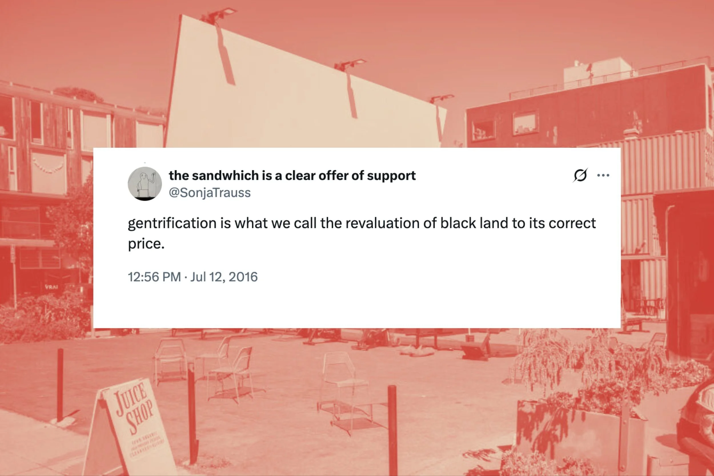 Sonja Trauss, founder of YIMBY, with a 2016 tweet of her thoughts on "black land" in San Francisco. “gentrification is what we call the revaluation of black land to its correct price.”